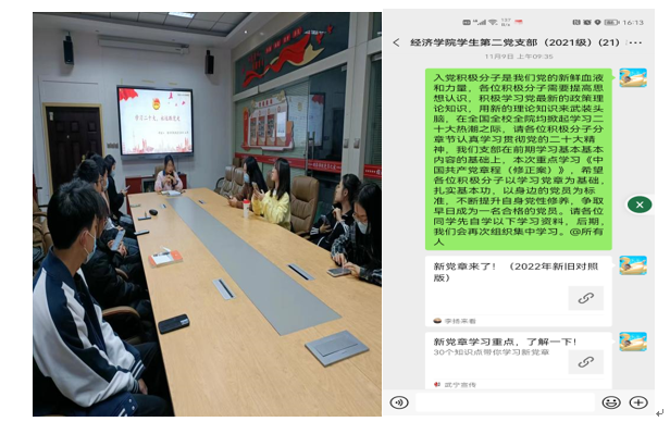 支部通过线上线下相结合的方式开展了一系列关于党章的学习研讨活动。11月22日,支部成员在二号楼308教室进行集体学习研讨。全体入党积极分子结合党的二十大精神,踊跃发言、充分讨论了对党章修正案的理解认识和自身学习感悟。