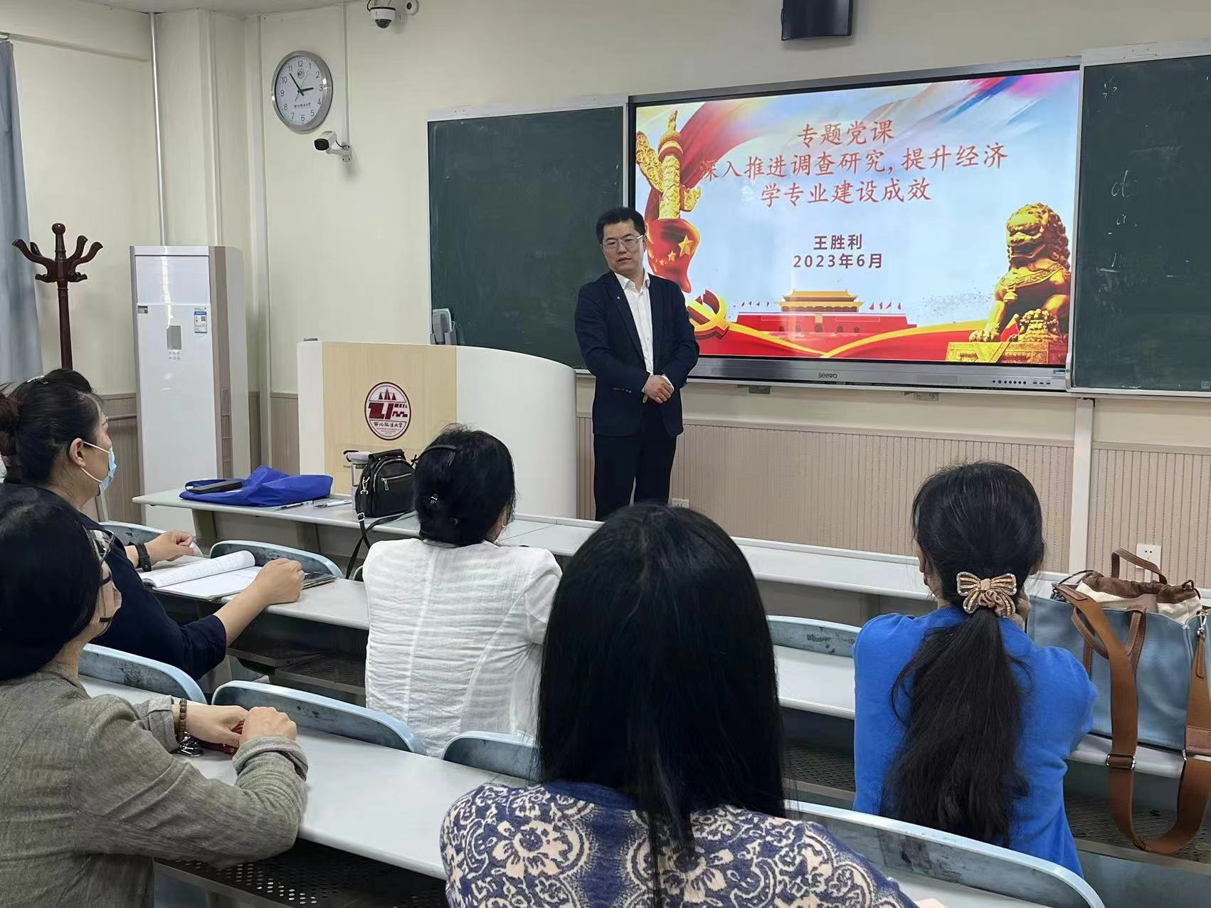 王胜利以《深入推进调查研究 提升经济学专业建设成效》为题,讲授主题教育专题党课。他强调调查研究的重要性及其在经济学专业建设中的应用。一方面,调查研究能够将经济学理论与实践有机结合,帮助深入了解经济的实际运行情况,及时捕捉到经济发展中的问题和矛盾。另一方面,调查研究能够辅助我们确定经济学专业建设的问题导向和需求驱动,根据实际需求开展有针对性的教学和科研工作,提高专业人才培养的适应性和针对性。作为经济学系专任教师,应该从以下几个方面重视调查研究在经济学学科建设中的作用:首先,通过调查研究了解学生对经济学专业课程的需求及反馈,针对问题进行改革和创新,提升课程质量和教学效果;其次,通过调查研究发现前沿领域的热点问题,积极参与科研创新,推动学术发展,提升学科影响力和竞争力;最后,通过调查研究了解学生实践教学的需求和社会服务的重点,为学生提供更加贴近实际的实践机会,增强专业素养和社会责任感。