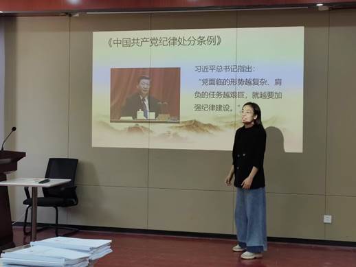 刘瑞娟为参会成员讲授纪律党课,针对《中国共产党纪律处分条例》新增和修改的部分重要内容进行解读。她指出,要把开展党纪学习教育作为当前和今后时期的一项重要政治任务,坚持个人自学与集中学习相结合,在推动《条例》入脑入心、深化《条例》理解运用上下功夫,发挥教师党员先锋模范带头作用,让党纪学习教育成效转化为推动工作的有效举措,保持党的先进性和纯洁性。