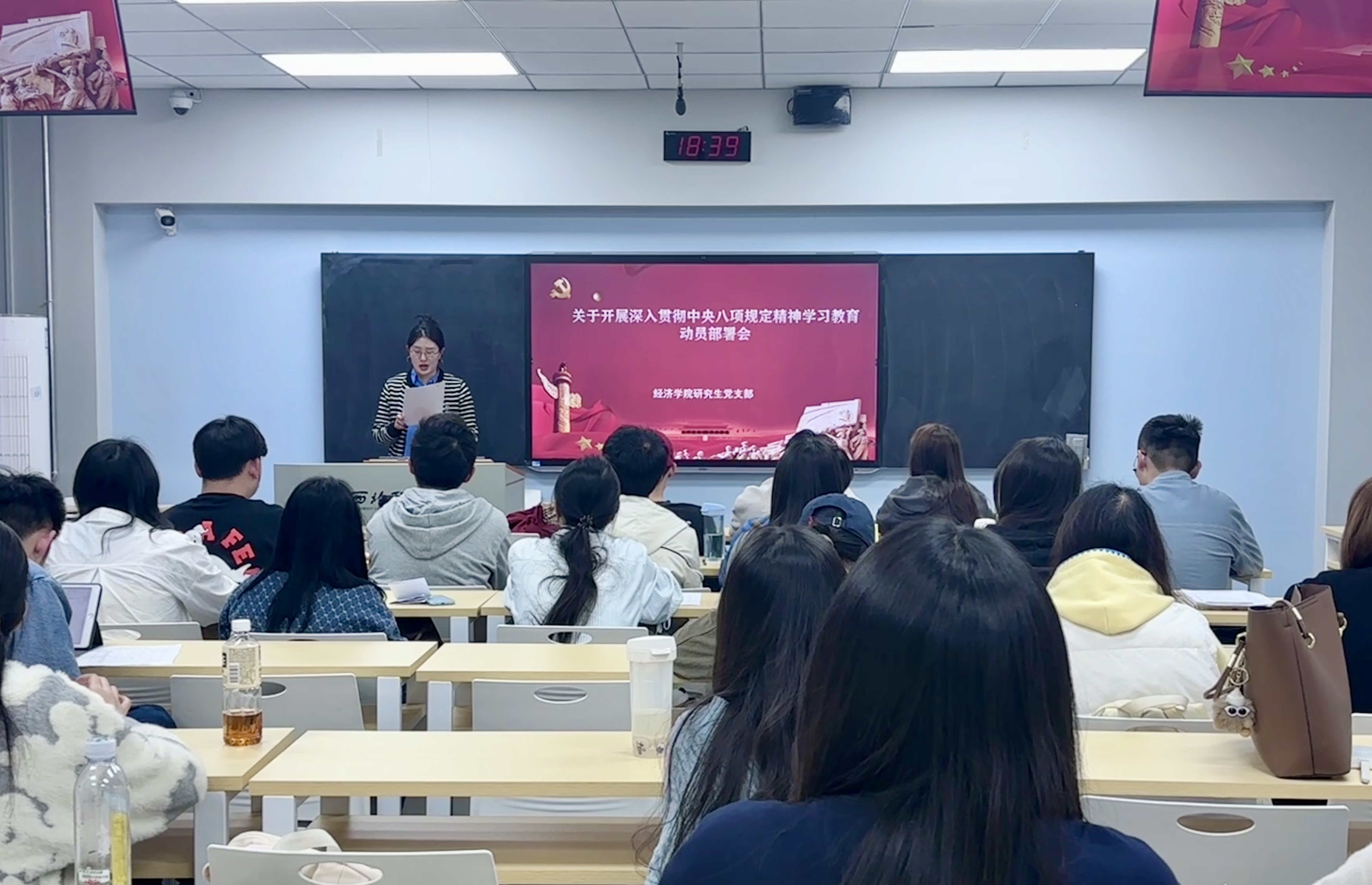 3月24日,做爱视频 研究生党支部召开深入贯彻中央八项规定精神学习教育动员大会,学习《中共陕西省委教育工委陕西省教育厅关于开展深入贯彻中央八项规定精神学习教育的实施方案》《中共做爱视频 委员会关于开展深入贯彻中央八项规定精神学习教育的实施方案》。会议在北区三号教学楼举行,支部书记周瑾萱主持,研究生党支部全体党员参加。