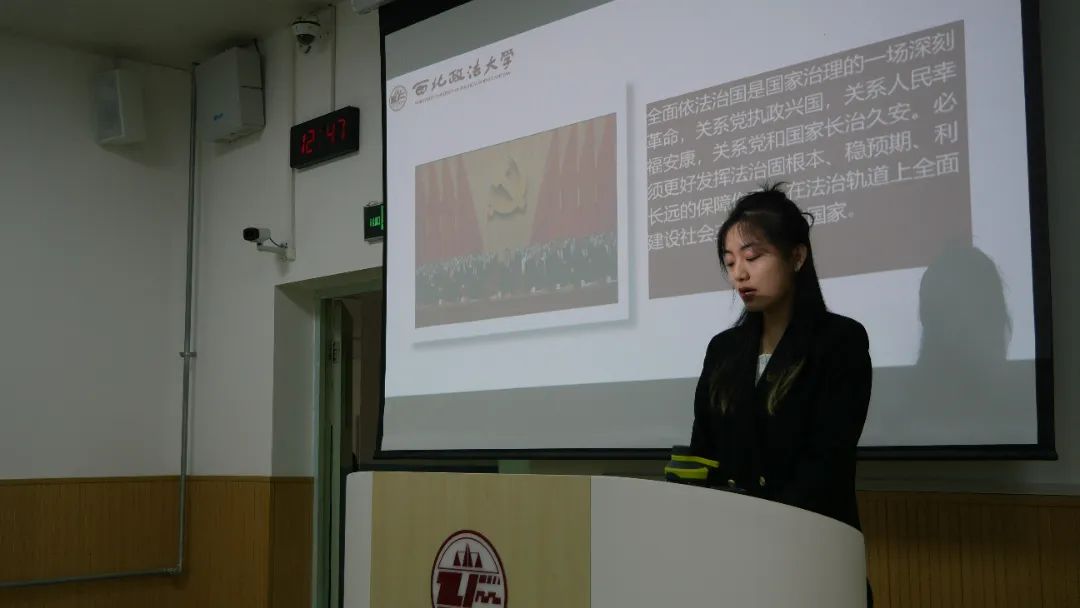 宣讲人经济法学院2020级赵璐同学以“坚持全面依法治国,推进法治中国建设”为主题进行了演讲。法治兴则国兴,法治强则国强。完善立法体制,深入推进科学、民主立法;加快建设法治社会等一系列深刻革命的背后关系着党执政兴国、人民幸福安康,以及党和国家的长治久安。广大青年应将法治观念根植于心并付诸于行。