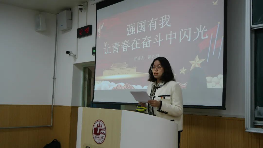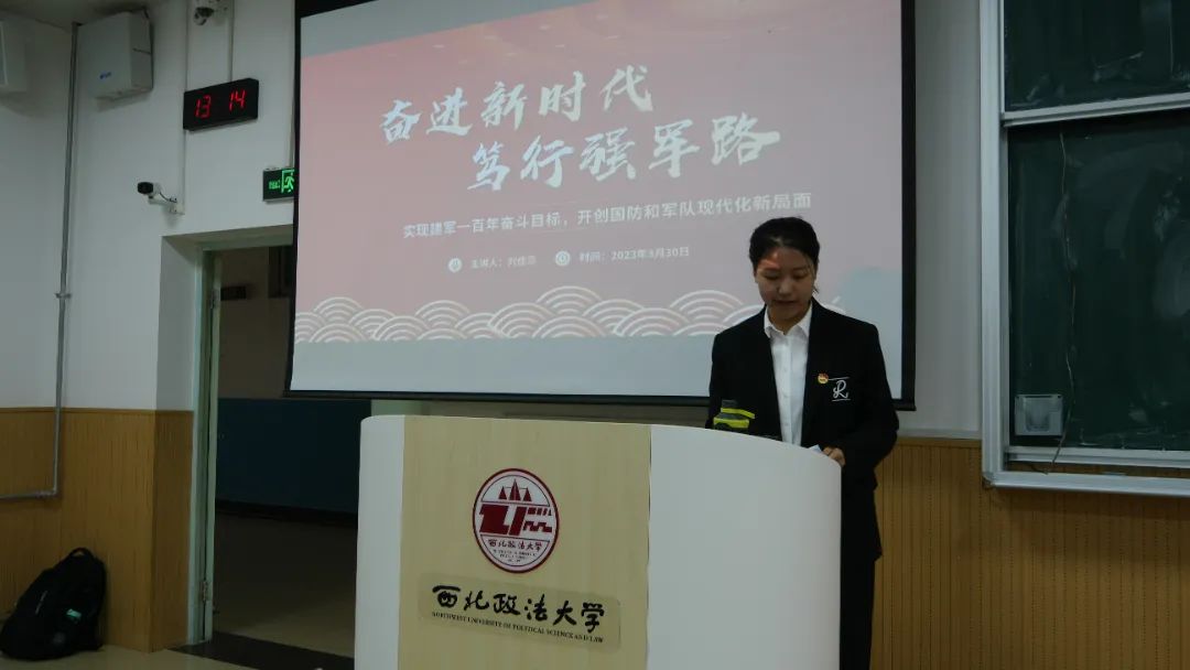 宣讲人外国语学院2022级刘佳蕊同学围绕“奋进新时代,笃行强军路”进行了宣讲。强军之魂,在于使命;强军之基,在我青年。无数青年源源不断的加入为人民而战的队伍,选择成为一名光荣的解放军战士,相信未来依然如此。我们知道人民军队吃苦在前,为人民而战,为国家而战。我们也更愿意成为这样的人,投身国防事业,尽个人所能,护一方安宁。