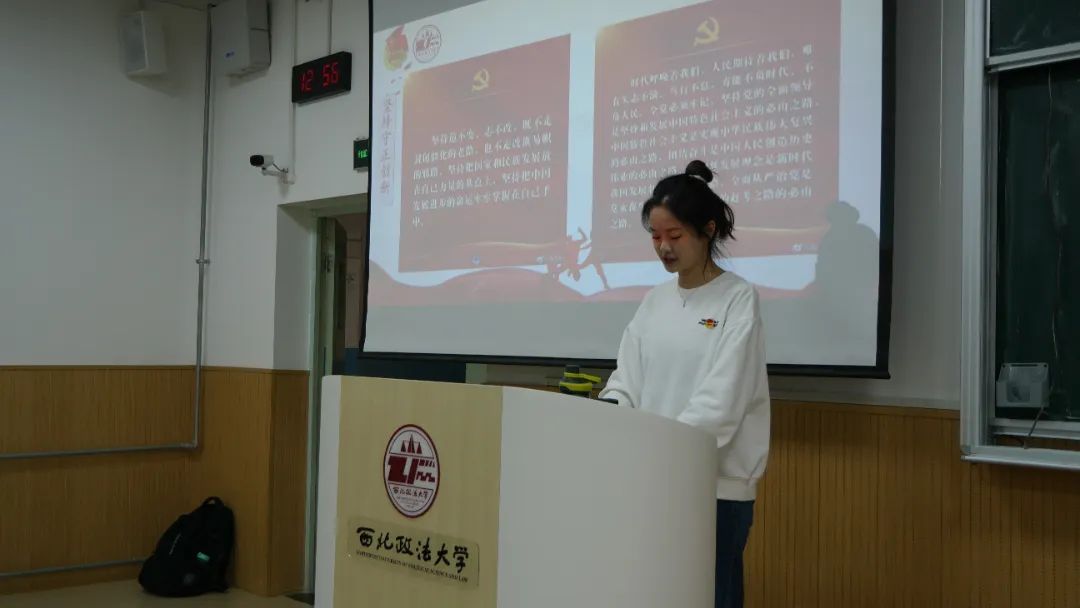 宣讲人商学院2020级艾欣羽同学从“六个坚持”着手进行宣讲。坚持人民至上、坚持自信自立、坚持守正创新、坚持问题导向、坚持系统观念、坚持胸怀天下,这既是我们深刻理解习近平新时代中国特色社会主义思想必须牢牢把握的基本点,也是持续马克思主义中国化时代化必须始终坚持的基本点。作为党的后备军,我们要矢志不渝,笃行不怠,方能不负时代,不负人民。