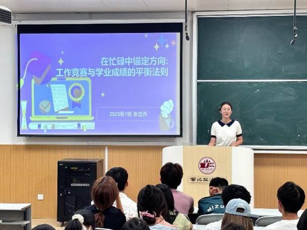 会上,2023级张楚乔以“锚定方向、高效突破”为主题,结合自身实践向大家分享平衡多线任务的核心心得。她强调,面对学业、竞赛与工作的多重压力,需以目标为导向科学规划时间,注重劳逸结合保持持续动力;同时,她建议在参与各类竞赛时,积极运用专业知识,在实践中思考,在实践中进步,团队成员有序分工,积极协作,各自发挥个人优势,打造优秀合作成果。