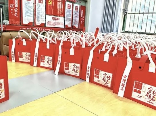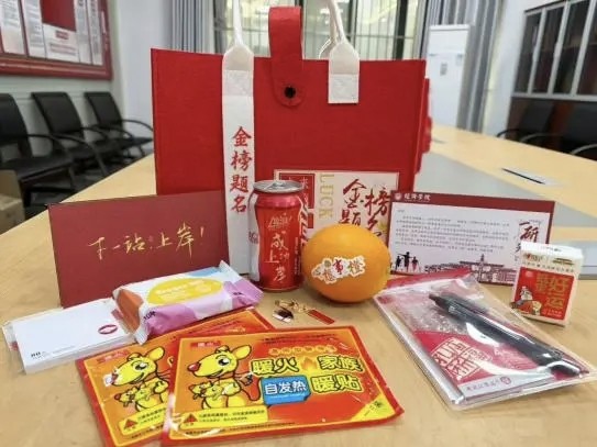 这份温暖与期许,凝聚在学院悉心筹备的十件寓意深远的暖心好物中,以“十全十美”的美好祝愿陪伴学子逐梦征程:象征“文”思泉涌的文具套装,承载“暖”意相伴的两枚暖贴,寓意心想事“橙”的新鲜橙子,蕴藏“纸”定上岸的小包纸巾,代表“拭”去烦恼的湿纸巾,寄托“遍”通考点的便利贴,印有“成功上岸”的定制可乐,写有一“研”为定的祝福卡片,承载“金榜题名”真挚期许的钥匙扣。