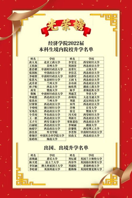 2022年全国硕士研究生录取工作已经落下帷幕,经济学院研究生考试报考人数205人,占毕业生总人数62.8%。2022届本科毕业生升学去向中,考研成功53人,考研率为16.25%。考取国内高校45人,其中考取外校30人,占考研成功总人数的56.6%;出国(境)深造8人,占考研成功总人数的15.1%。