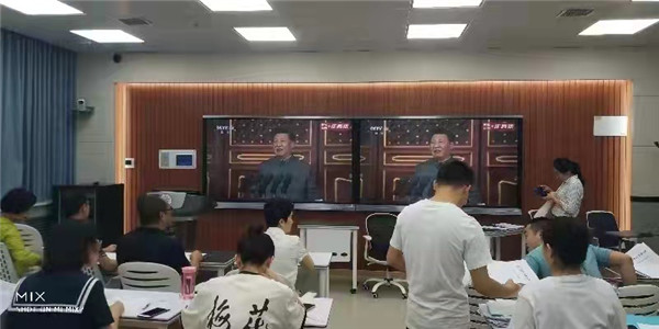 上午7点50,学院师生在指定集中收看地点集合就位,佩戴党徽,庄重而热切地等待大会直播开始。