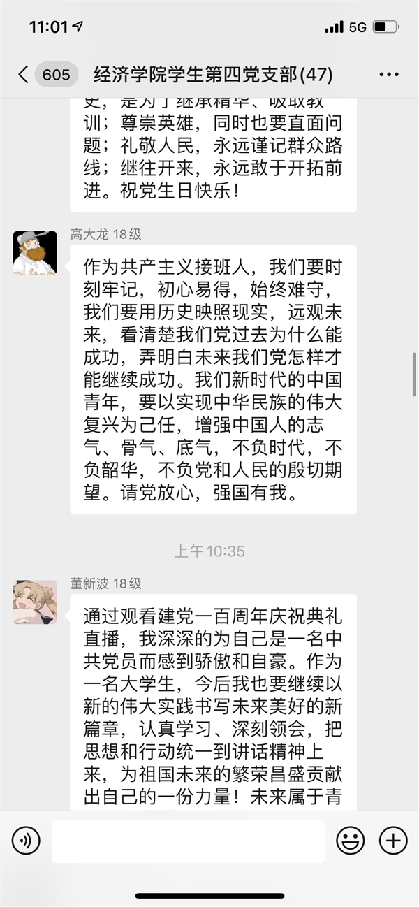 2018级学生党员高大龙表示,“作为共产主义接班人,我们要时刻牢记,初心易得、始终难守,我们要用历史映照现实,远观未来,看清楚我们党过去为什么能成功,弄明白未来我们党怎样才能继续成功。我们新时代的中国青年,要以实现中华民族的伟大复兴为己任,增强中国人的志气、骨气、底气,不负时代,不负韶华,不负党和人民的殷切期望。”