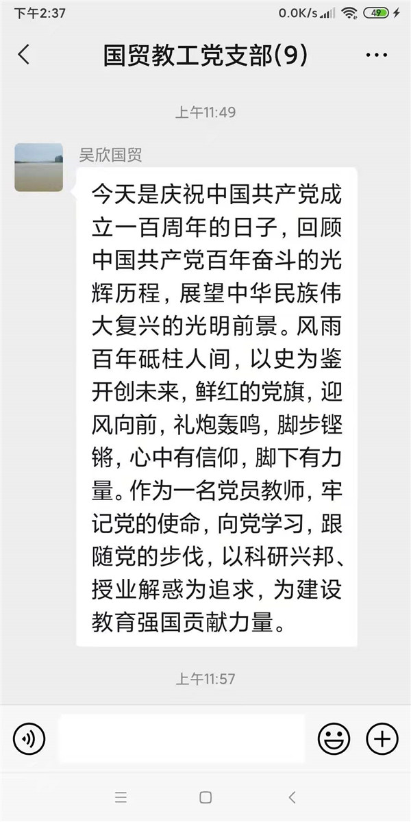 教授、硕士生导师王凤丽老师谈到,我大学本科是学历史的,当了高校教师后,又教了近十年的中国近现代史、中共党史。我深知是历史和中国人民选择了中国共产党,中国共产党没有辜负中国人民和历史的选择。一百年来中国共产党在血雨腥风中成长壮大,团结带领中国人民书写了恢宏的史诗,实现了中华民族的伟大复兴。正向习近平总书记所说:“我们要用历史映照现实,远观未来。看清楚过去为什么能够成功,弄明白未来怎样才能继续成功”。作为一名高校教师和老党员,更应该不忘初心、坚定理想信念。教育培养青年学生爱党爱国,以实现中华民族伟大复兴为己任。不负时代、不负韶华、不负党和人民的殷切期望,在这美好的时代,不负美好的自己!