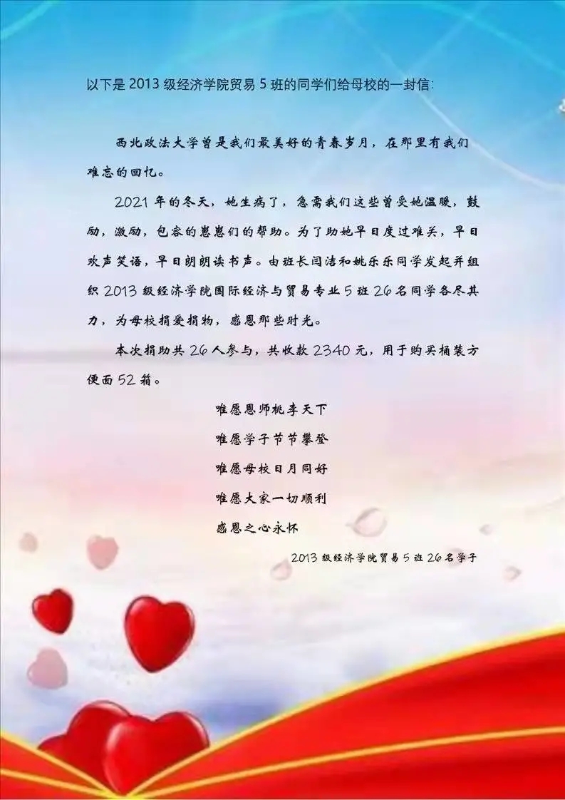 同时,2013级国贸五班全体同学给母校写下了一封信: