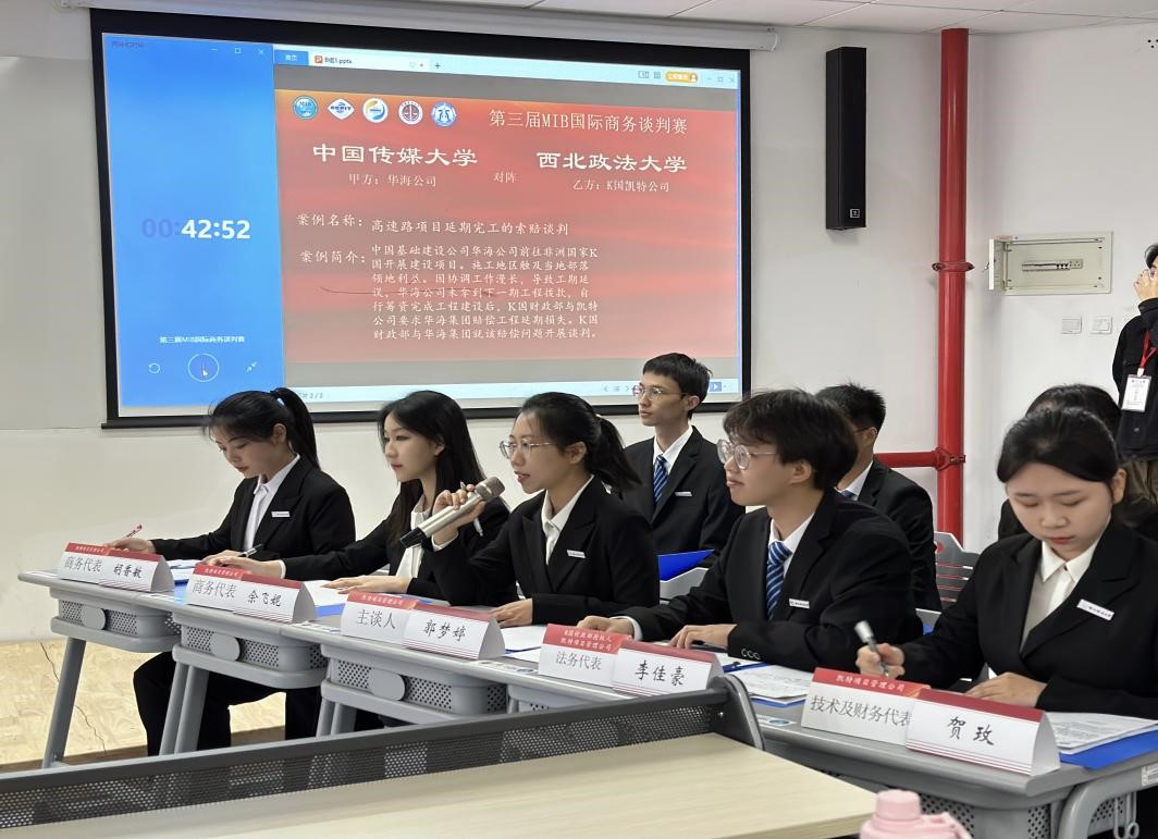 4月22日上午预赛拉开序幕,我校代表队与中国传媒大学代表队就“高速路项目延期完工是否索赔谈判”为题谈判,比赛过程中,我队始终表现出良好的商务礼仪、多元的谈判思维、严密的谈判逻辑、流畅的语言表达以及默契的团队协作,各学生谈判代表始终沉着冷静、松弛有度,充分展现出我队合理的谈判策略和专业的谈判素养。