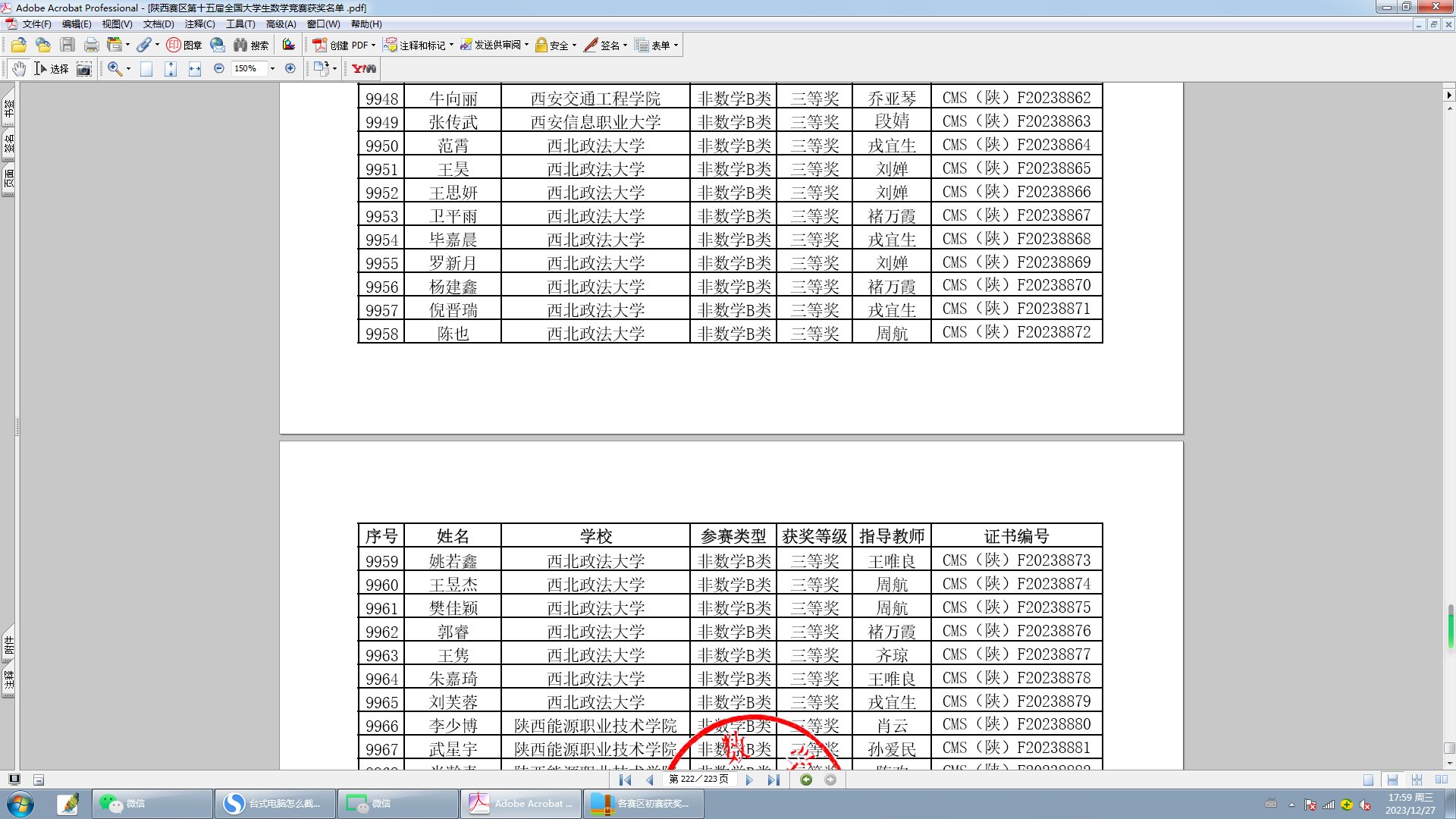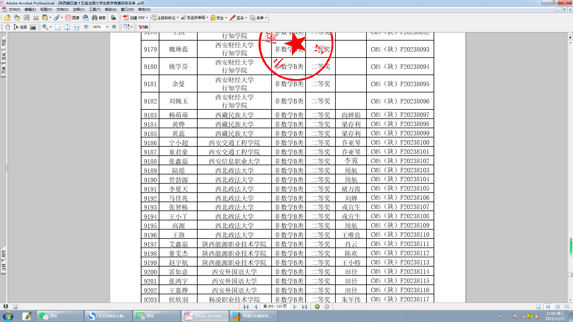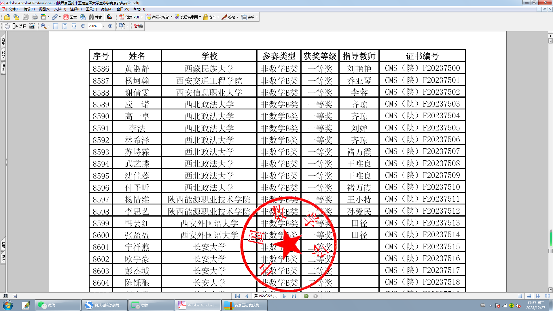 近日,第十五届全国大学生数学竞赛成绩揭晓,我校参赛学生取得优异成绩。在本次竞赛中,我校有90名学生参加非数学B类比赛,共有32名同学获奖。其中8名同学获得陕西赛区一等奖,8名同学获得陕西赛区二等奖,16名同学获得陕西赛区三等奖。