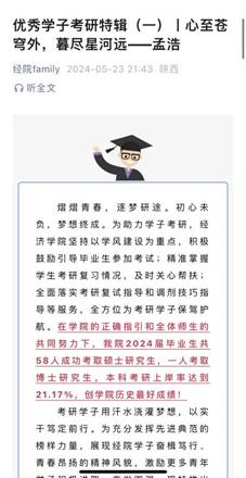 一是依托党、团支部积极开展活动。将学风建设融入新生入学教育和毕业生教育,通过特殊节点开展主题党、团日,帮助学生端正思想态度,坚定理想信念,让思想和学习共同提升。二是分层分类开展学风大讨论。围绕我校关于深化校风学风建设目标责任,从年级—班级—宿舍—学生社区—团学骨干等各层面全覆盖召开学风建设动员大会、主题班会、座谈会等,确保学风建设各项措施落到实处。三是积极宣传先进典型。在学院公众号打造“经院青年说”“优秀学子考研特辑”“优秀学子就业特辑”等栏目,宣传在保研、考研、就业等各方面表现优秀的学生事迹,通过榜样示范作用不断增强学生专业认同感和就业自信心。