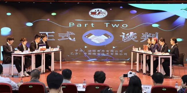 本次大赛共有来自全校10个学院17个专业600多名学生组成的146支团队报名参赛。经过初赛和复赛的激烈角逐,共有2支团队入围决赛,民商法、经济法、国际法和新闻传播学院学生组成的“杰鸽鸽嘟队”代表谈判甲方,经济学、民商法、经济法和政治与公共管理学院学生组成的“TCL集团Z队”代表谈判乙方。双方就法国赛昂有限公司拟采购中国瑞安技术有限公司的氢能源动力机车配件S轴承相关商务、法务等议题展开了精彩的谈判。