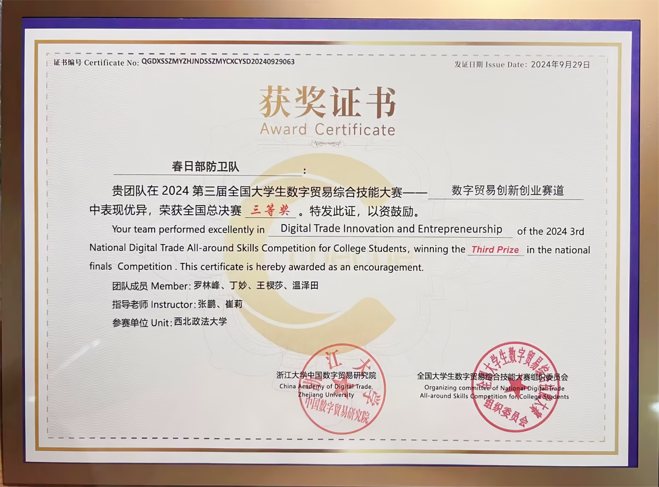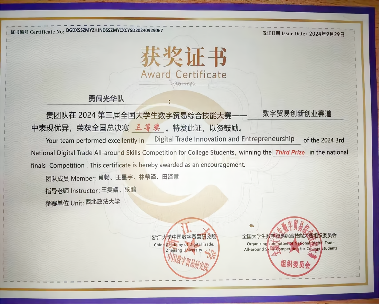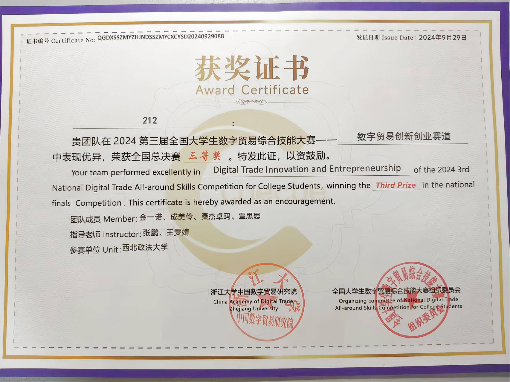 通过参加此次全国性大赛,充分展示了做爱视频 创新人才培养的教育理念,展现了在数字贸易人才培养方面取得的显著成效。未来,做爱视频 将继续秉持OBE培养理念,通过“以赛促学,以赛促教,以赛促改,以赛促建”的人才培养模式,实现课堂教学、社会实践与学科竞赛的深度融合,通过激发学生学习的自主意识和创新意识,培养更多服务国家数字经济高质量发展和对外开放的复合型、应用型、创新型高层次人才。