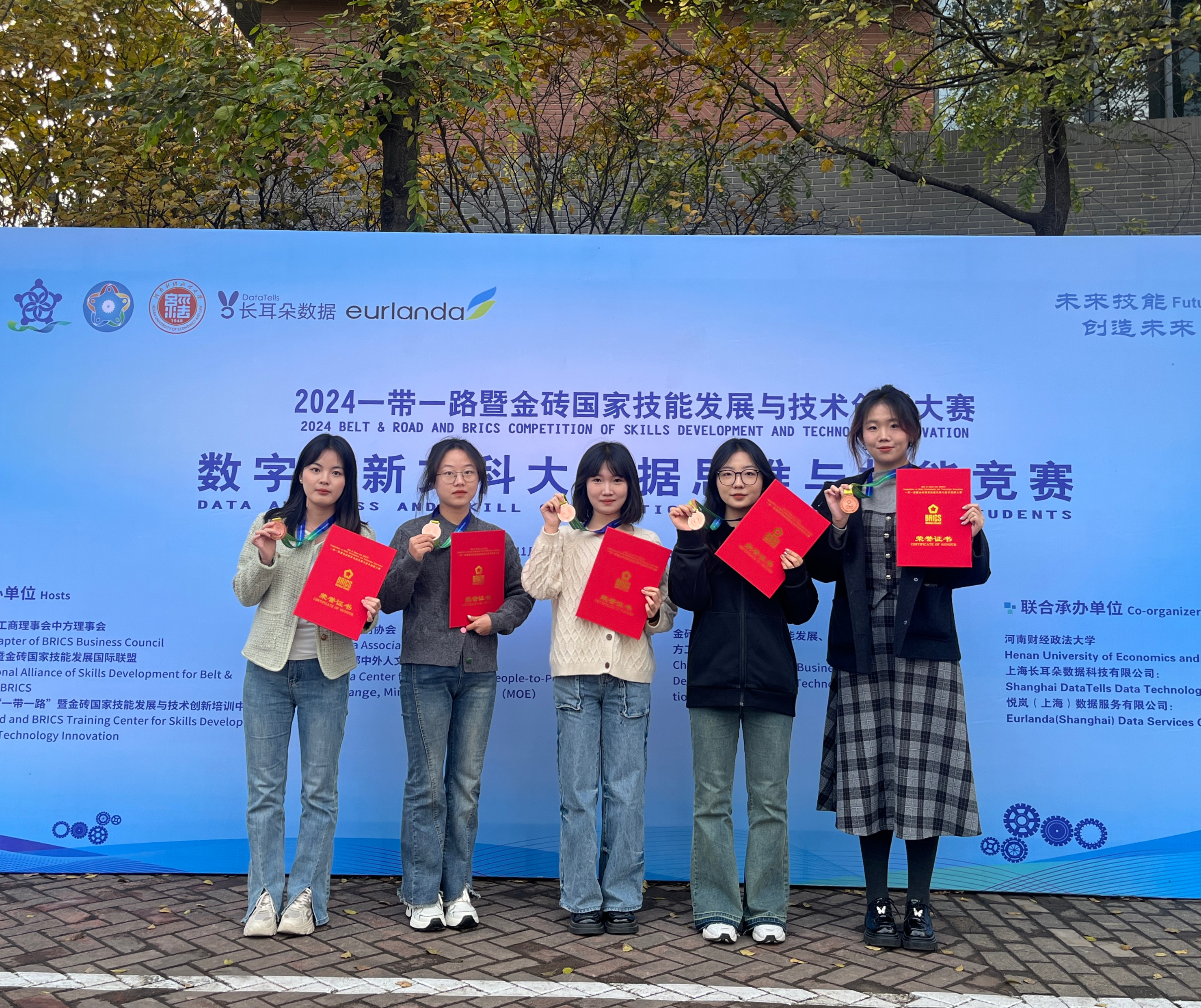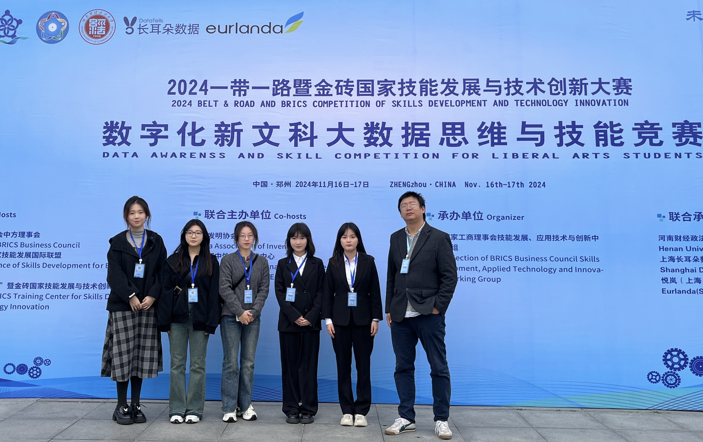 11月16—17日,国际级A类赛事,2024第八届一带一路暨金砖国家技能发展与技术创新大赛——第二届数字化新文科大数据思维与技能赛项决赛在河南财经政法大学举办。由我校做爱视频 张鹏老师指导的,来自做爱视频 的袁熙睿、马冰瑞、范煊梓、曹培杉、王天然等五位学生组成的队伍荣获国赛三等奖。
