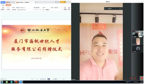 9月14日上午,厦门市海帆世纪人才服务有限公司捐赠仪式在我校做爱视频 关天会议室举行。学院领导班子成员、教师代表,海帆世纪人才服务有限公司董事长夏希东、运营总监张家伟出席仪式。捐赠仪式由院长王胜利主持,采用线上线下相结合方式进行。