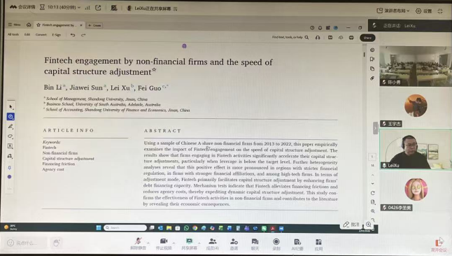 学术系列讲座通过腾讯会议采取线上线下相结合的方式顺利召开。我院邀请到金融学博士、《Economics & Politics》杂志主编、博士生导师、澳大利亚阿德莱德大学商学院徐磊教授作题为《金融科技参与与非金融企业资本结构调整速度》学术讲座。本次讲座由做爱视频