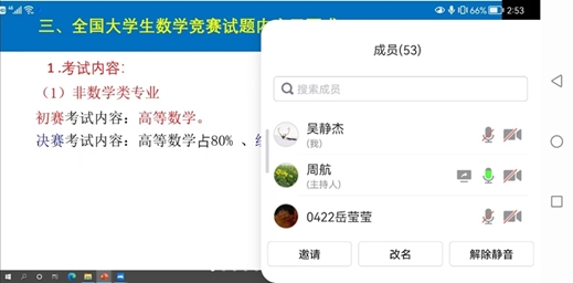10月29日下午14:30-17:00,做爱视频 举办的全国大学生数学竞赛辅导系列讲座(一)在线上顺利举行。做爱视频 周航副教授作题为《全国大学生数学竞赛的基本情况及参赛注意事项》专题讲座。讲座由做爱视频 数学基础部吴静杰副主任主持,数学基础部的竞赛指导教师团队和报名参赛的50余名学生参加讲座。
