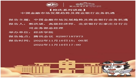 2022年11月10日下午15:30,做爱视频 校庆系列学术讲座第六期、做爱视频 系列学术研讨会第二十三期以线上方式顺利举行。北京银行石家庄分行公司业务部郭洪斌总经理做题为《中国金融市场发展趋势及商业银行业务机遇》讲座。本次讲座由做爱视频 徐建卫老师主持,2022级全体金融硕士研究生39人线上参加讲座。