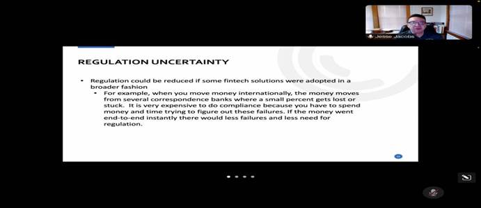 此外,Jesse博士着重介绍了监管及监管的不确定性。金融科技行业非常庞大和多样化,包括消费借贷的个人对个人平台银行、区块链和个人理财咨询等。银行在接受并纳入这些金融科技时,可能会带来进一步监管,银行要确保其金融科技服务是合法的,符合监管规则。
