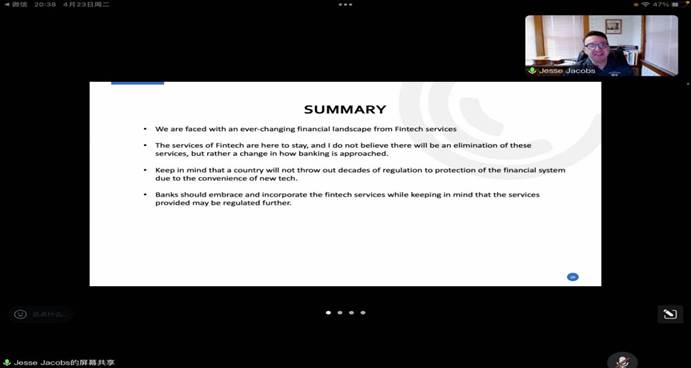 最后,Jesse博士对本次讲座进行了总结。金融科技服务带来了不断变化的金融格局,金融科技服务将持续存在并改变银行的运作方式,银行应接受金融科技服务并注意其所带来的监管。