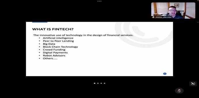 Jesse博士首先介绍了何为金融科技并解释了为什么我们迎来了金融科技的增长。其次,Jesse博士介绍了银行和金融科技之间的关系以及银行是怎样改变的。随着金融科技的发展,银行与金融科技必须共存,银行要不断进行创新,将科技服务纳入其中。