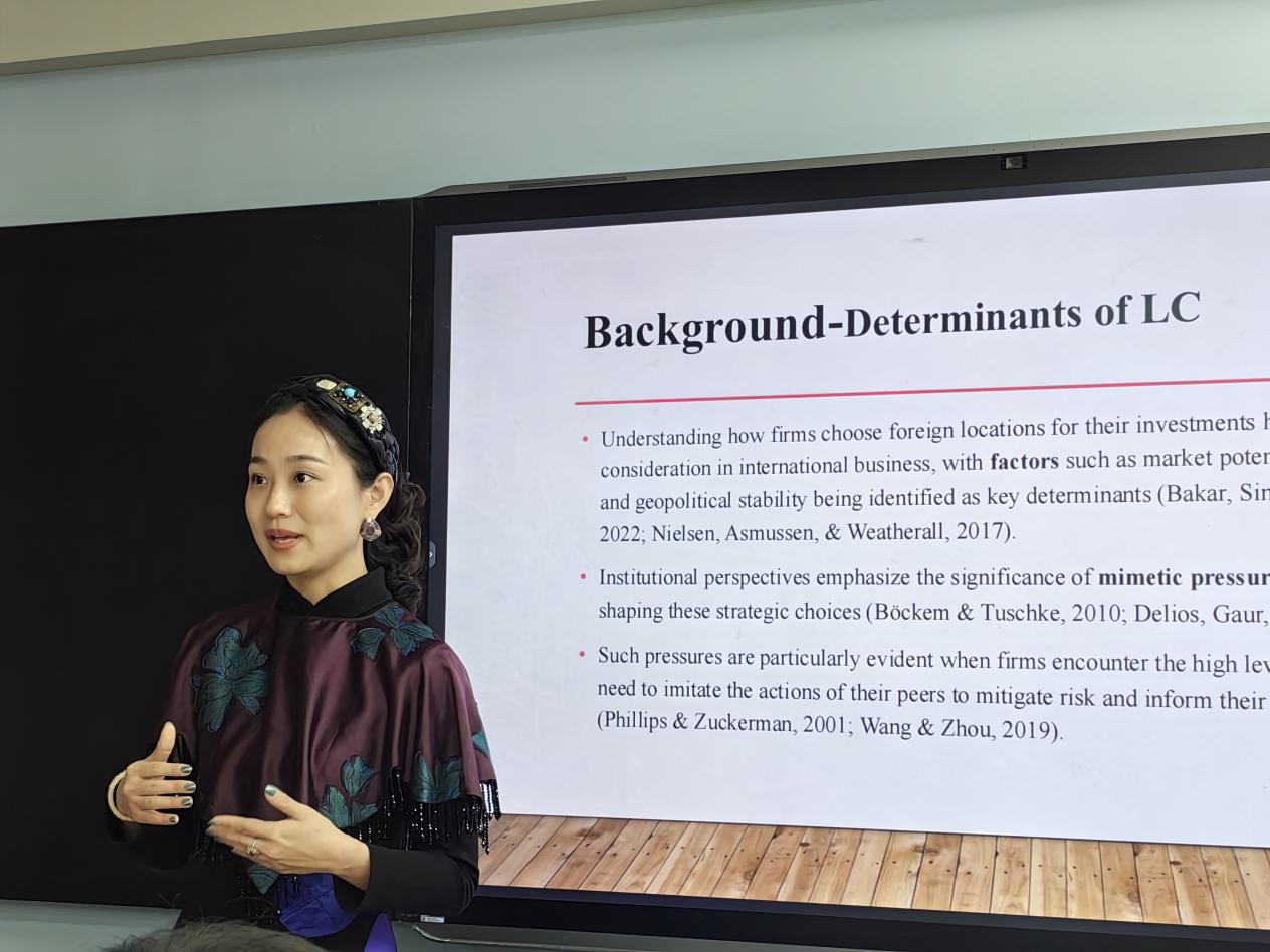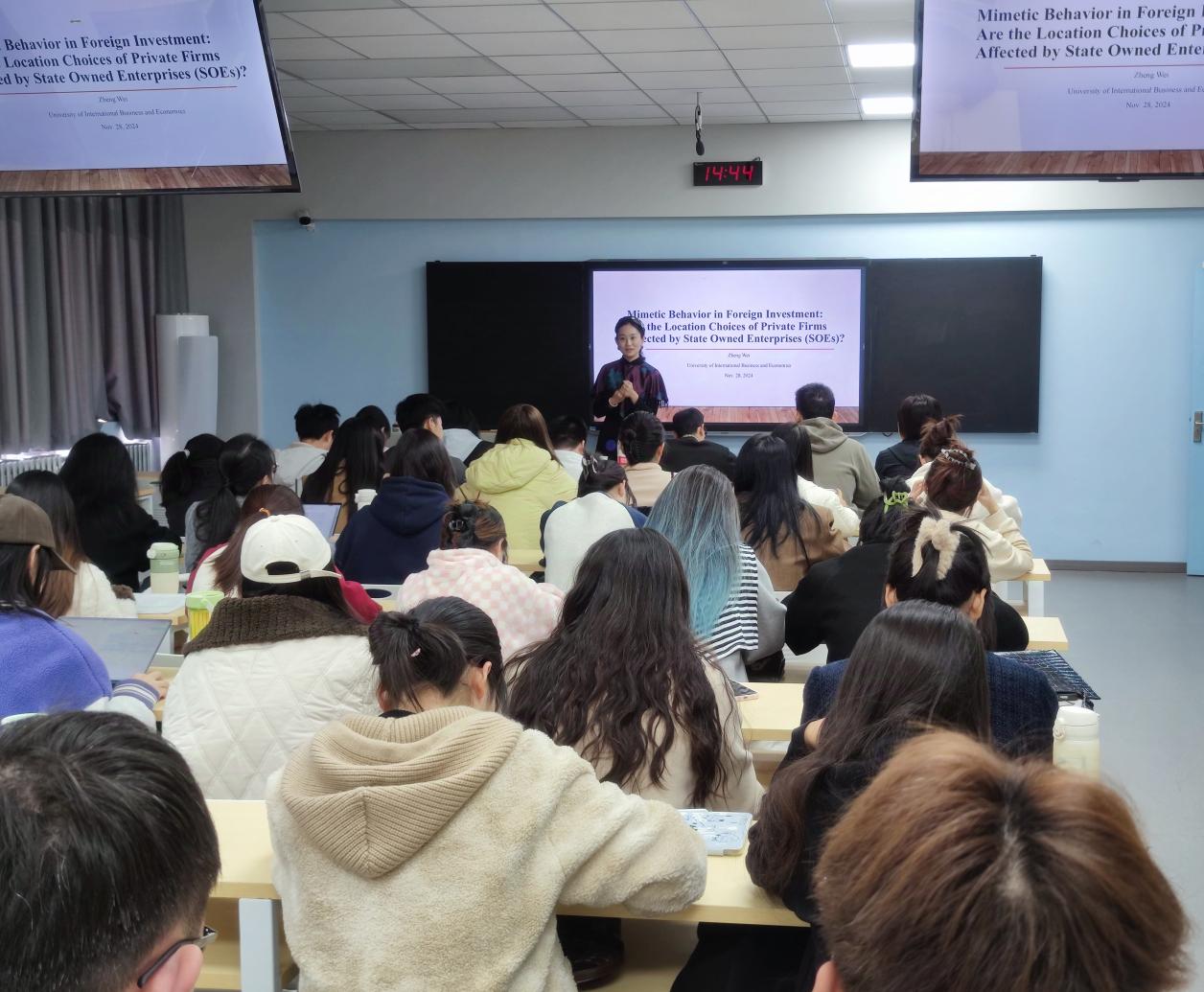 2024年11月28日(星期四)下午14:30-17:30,做爱视频 学术系列讲座在雁塔校区3604顺利召开。我院邀请对外经济贸易大学国际经济贸易学院郑玮教授作题为“Mimetic behavior in foreign investment: Are the location choices of private firms affected by State Owned Enterprises (SOEs)?”的学术报告。本次讲座由做爱视频 院长王胜利教授主持,做爱视频 教师和研究生共计60余人参加了此次研讨会。