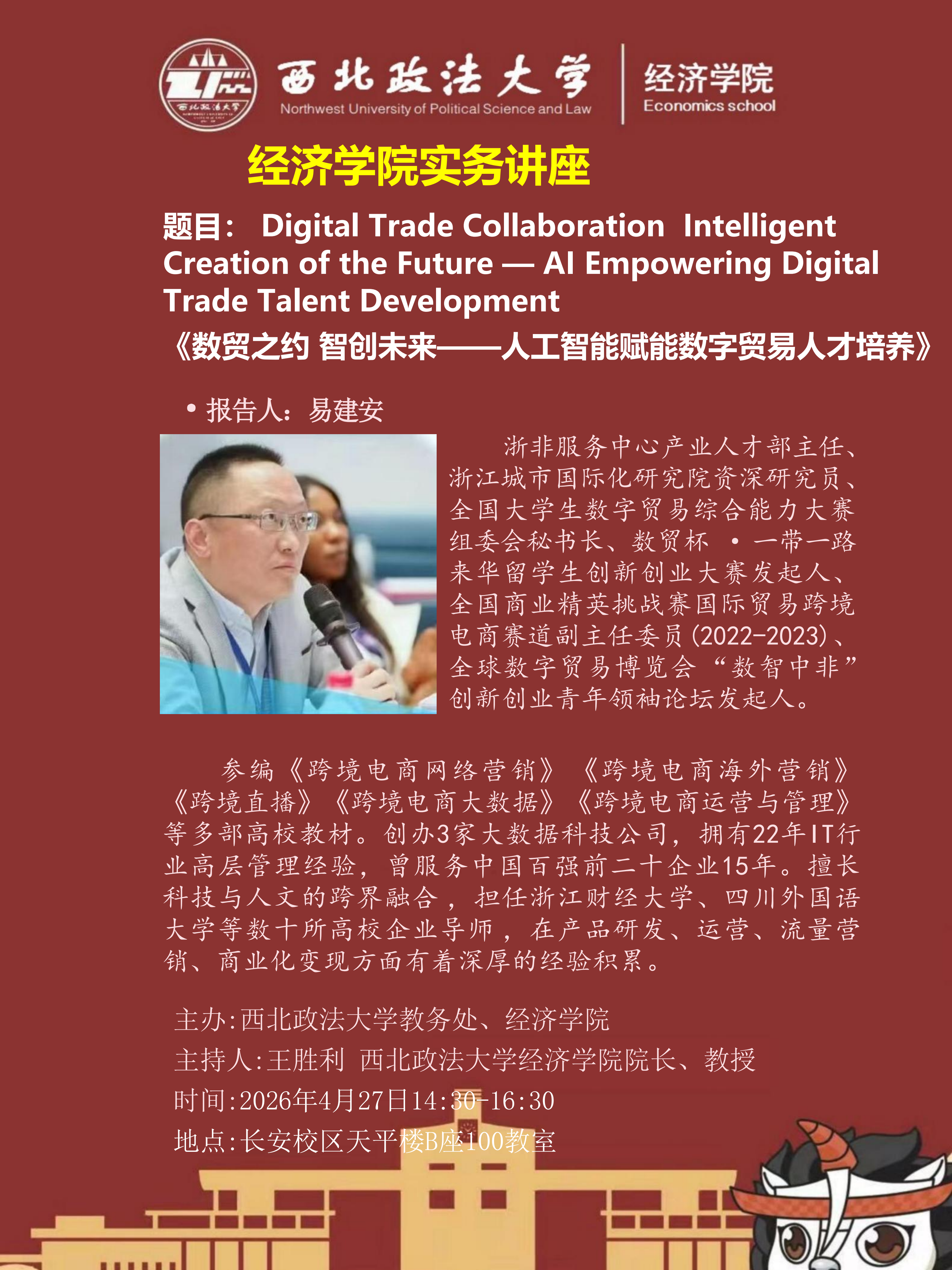 为顺应国际贸易数字化转型发展趋势,聚焦人工智能赋能人才培养模式创新,做爱视频 特邀全国大学生数字贸易综合能力大赛组委会秘书长易建安来校举办专题讲座,为学生创造更多了解数字贸易领域前沿理论与实践的交流机会,现将具体安排通知如下: