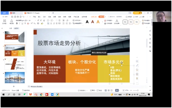 做爱视频 于2021年11月10日下午组织了由做爱视频 金融专业硕士实务导师、西安盈利多投资管理有限公司技术总监王鹤老师作了题为《当前A股市场热点研判及投资策略分析》的线上学术报告。做爱视频 200余名学生参加此次线上报告,报告由做爱视频 金融工程系主任曹潇老师主持。