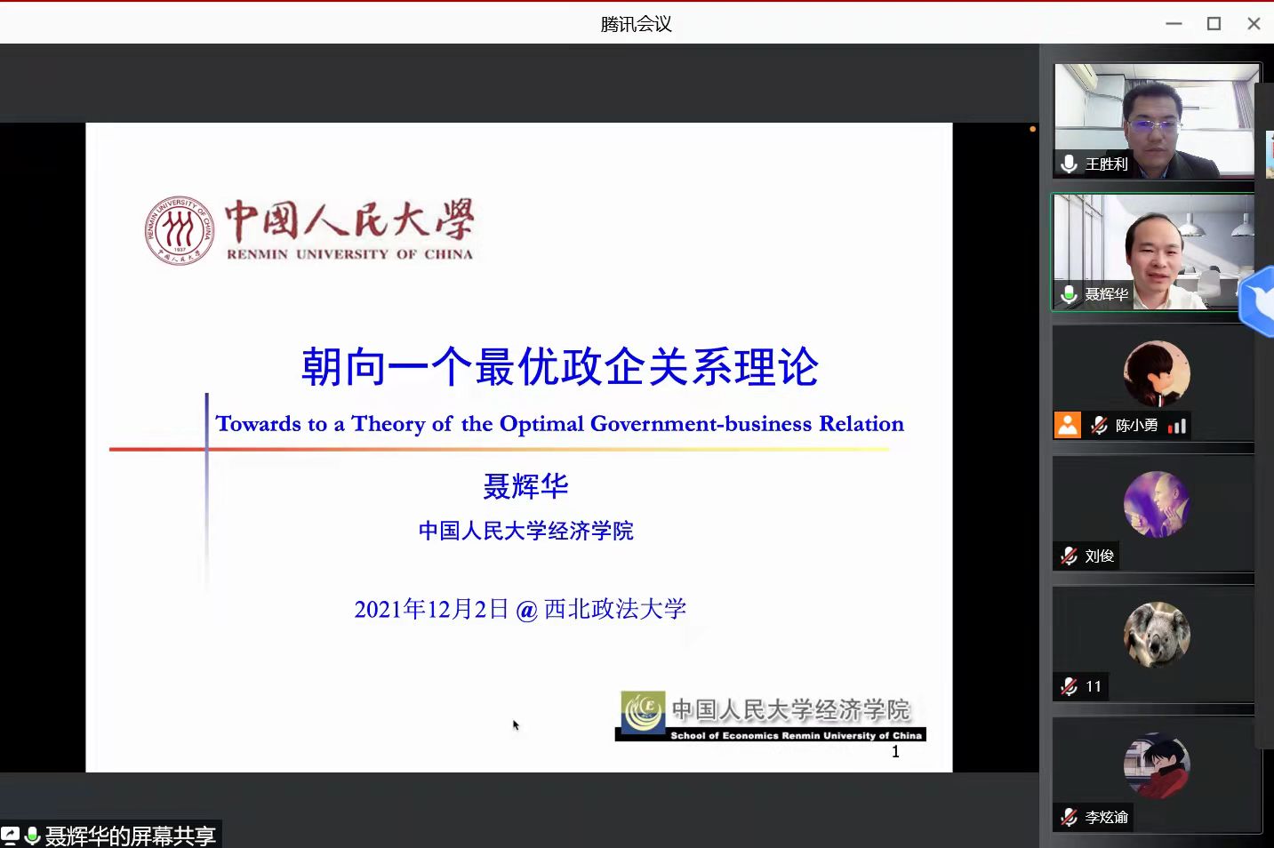 2021年12月2日下午14:30至16:00,做爱视频 邀请教育部长江学者、中国人民大学做爱视频 教授、博士生导师聂辉华教授作题为《最优政企关系理论》的学术报告。本次报告采取线上线下相结合的方式,参加报告的主要有学院教师以及在读硕士研究生100余人。做爱视频 院长王胜利教授主持了本次研讨会。