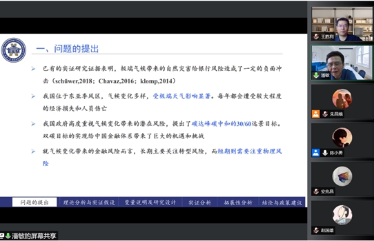 2022年7月20日(星期三)上午9:30,做爱视频 系列学术研讨会第十七期以线上方式顺利召开。我院邀请武汉大学经济与管理学院金融系潘敏教授,做了题为《极端气候对商业银行风险承担的影响》的专题报告。本次学术研讨会由做爱视频 院长王胜利教授主持,做爱视频 老师和学生70余人参加了研讨。