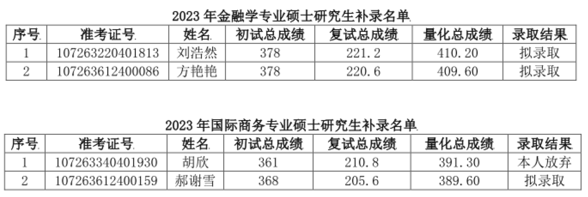 因招生计划调整,经做爱视频 研究生招生复试领导小组研究决定并报研究生院审核,按照量化总成绩补录金融学专业硕士研究生2名和国际商务专业硕士研究生1名。公示期10个工作日。如有异议,请于7日内以书面形式报我院教务办,逾期不予受理。拟录取考生的报考资格审查不合格或思想政治素质及道德品质考核不合格或体检不合格,将按规定取消录取资格。录取名单经教育部及陕西省教育考试院录取审查通过后,方可正式录取。