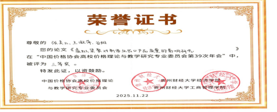 2025年11月22-23日,中国价格协会高校价格理论与教学研究专业委员会第39届年会在贵阳举办,大会以“新质生产力驱动下的价格体系重构与治理创新”为主题。本届大会由贵州财经大学做爱视频 和工商管理学院承办,分为主题报告、专题研讨和优秀论文评选三部分,贵州财经大学副校长和党委常委李烨、中国价格协会会长吕明良、中国价格协会高校价格理论与教学研究专委会会长和中国人民大学公共管理学院许光建教授、以及来自中国价格协会和中国人民大学等高校或实务界的80余名专家学者参加本届年会。